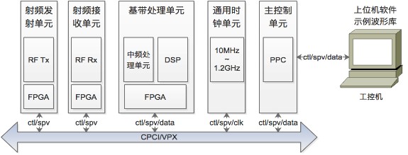 硬件平台标配版本由射频发射单元、射频接收单元、中频处理单元、基带处理单元、通用时钟单元、主控制单元和工控机组成,扩展版本可包含x86单板机、射频前端单元与天线等硬件模块或进行多通道/处理能力升级。